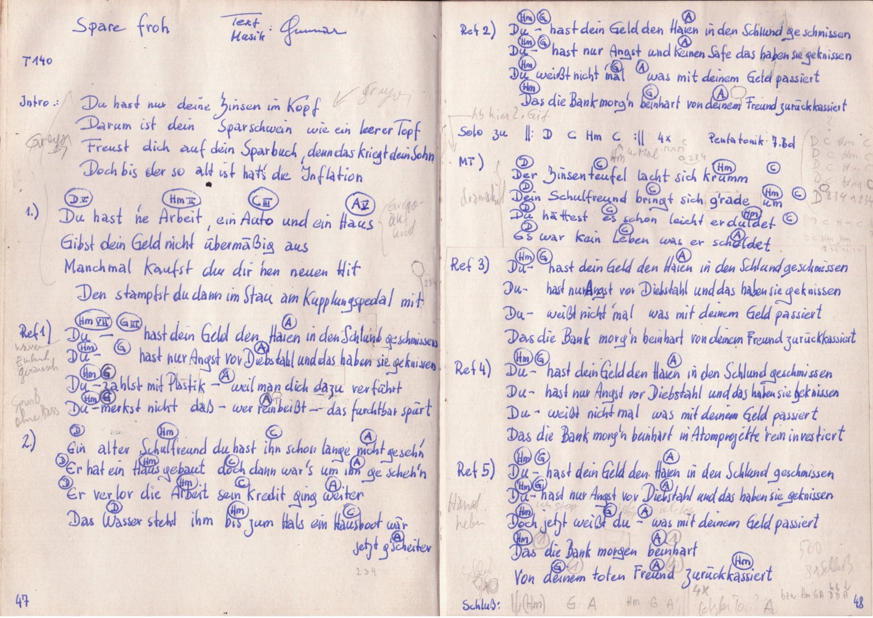 LizenzgeberInnen: (c)1995 Gunnar Pfeifer, 2014 Karin Eitel (Rechtsnachfolgerin)LFFI v1.0 im Sinne von http://www.neppstar.net Genre: Freie Musik - @Pop Info: Schlagzeug - Luigi Blaids, Bass -Bastrone Blaids, Gitarre - Strari Blaids, Geige - Vari Blaids, Gesang - Barbaretto & Blanca Blaids Text mit Griffen als JPEG